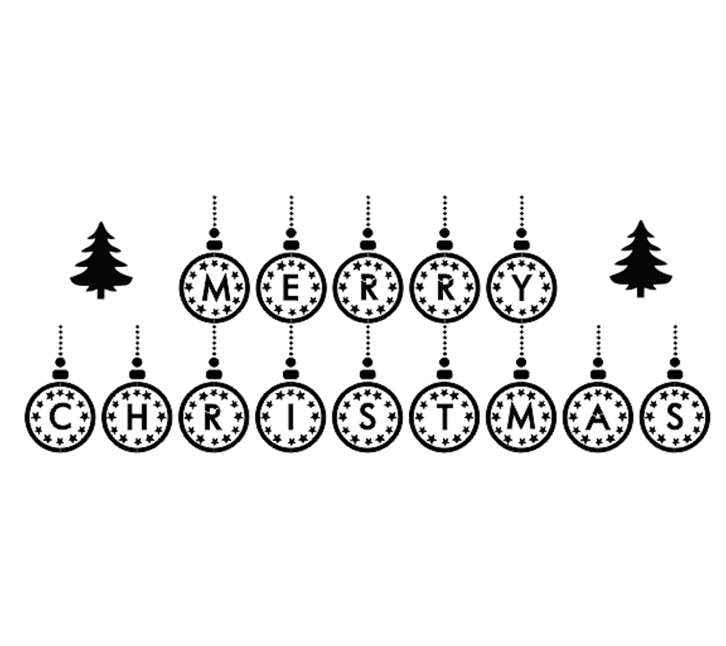 Cut out of baubles hanging on strings with Merry Christmas words | Stencil can be used to create festive scenes on windows sprayed with snow spray |